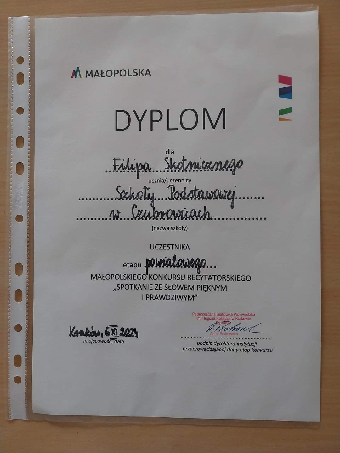 Informujemy, że uczeń klasy VII , Filip Skotniczny godnie reprezentował naszą szkołę w etapie powiatowym Małopolskiego Konkursu Recytatorskiego Spotkanie ze słowem pięknym i prawdziwym, którego organizatorami byli pracownicy Pedagogicznej Biblioteki Wojewódzkiej w Krakowie. Filip recytował dwa wiersze Juliana Tuwima: Rzecz czarnoleska i Modlitwa. Filipie, gratulujemy!