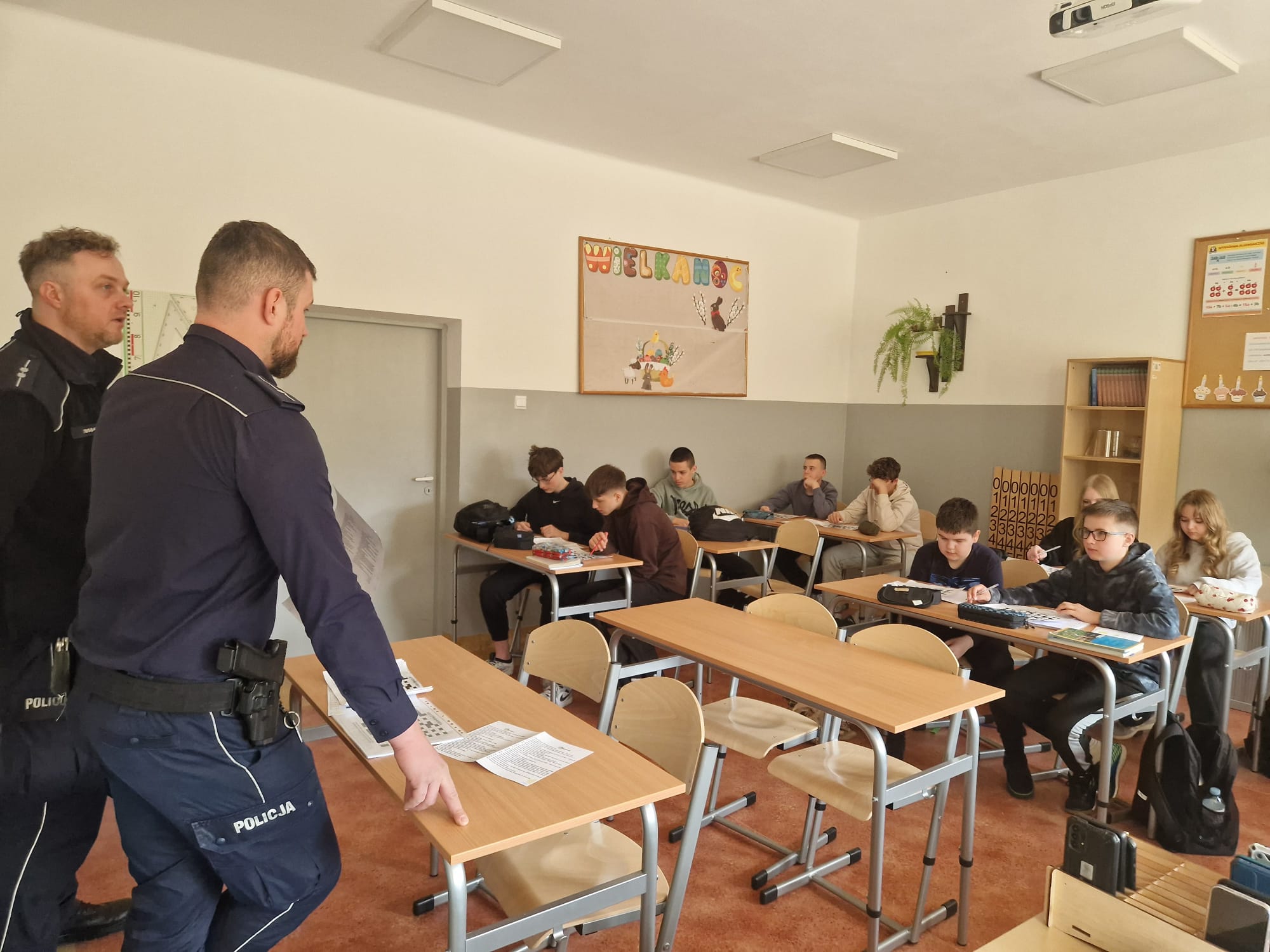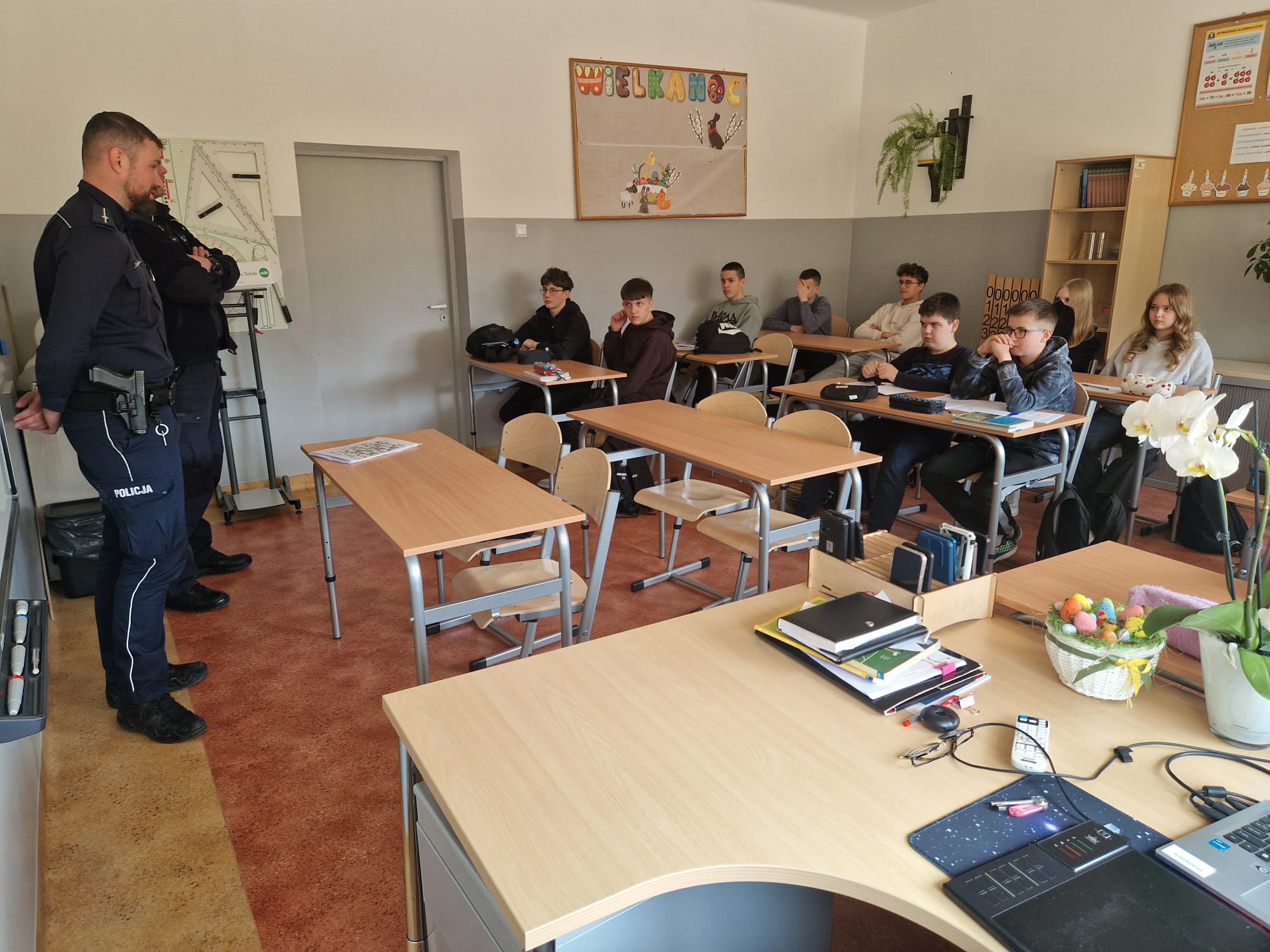Uczniowie klas 7 i 8 w dniu 25.03.2026 r. uczestniczyli w spotkaniu z policjantami, które odbyło się w ramach działań profilaktyczno-wychowawczych. Funkcjonariusze przeprowadzili prelekcję na temat używek, ich wpływu na zdrowie oraz konsekwencji związanych z ich stosowaniem. Spotkanie miało na celu zwiększenie świadomości młodzieży oraz promowanie zdrowego stylu życia.