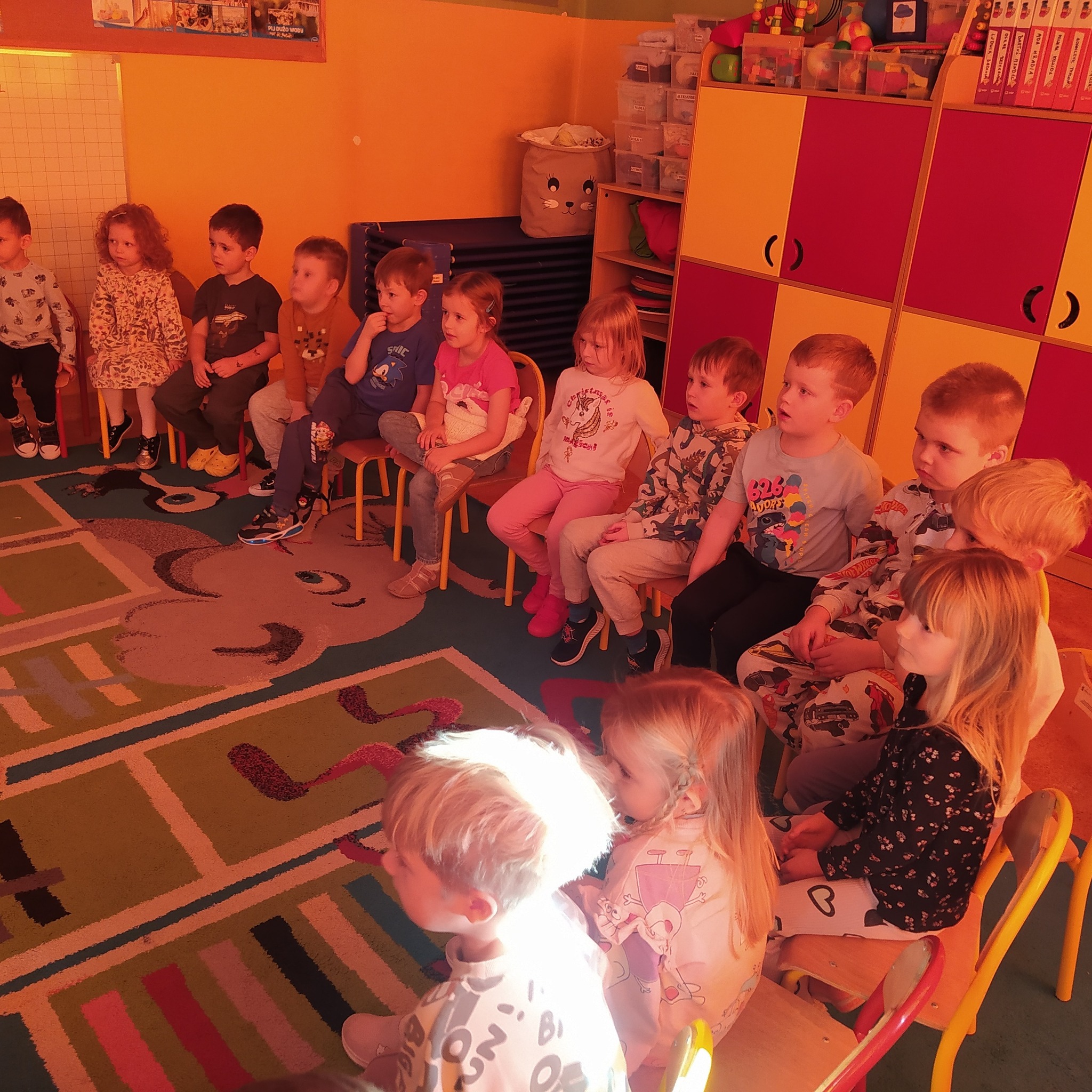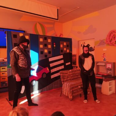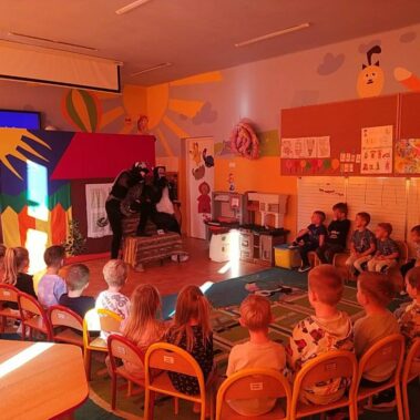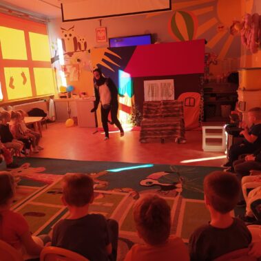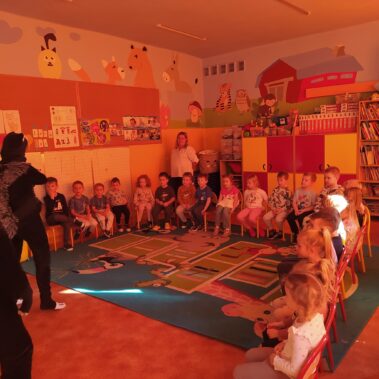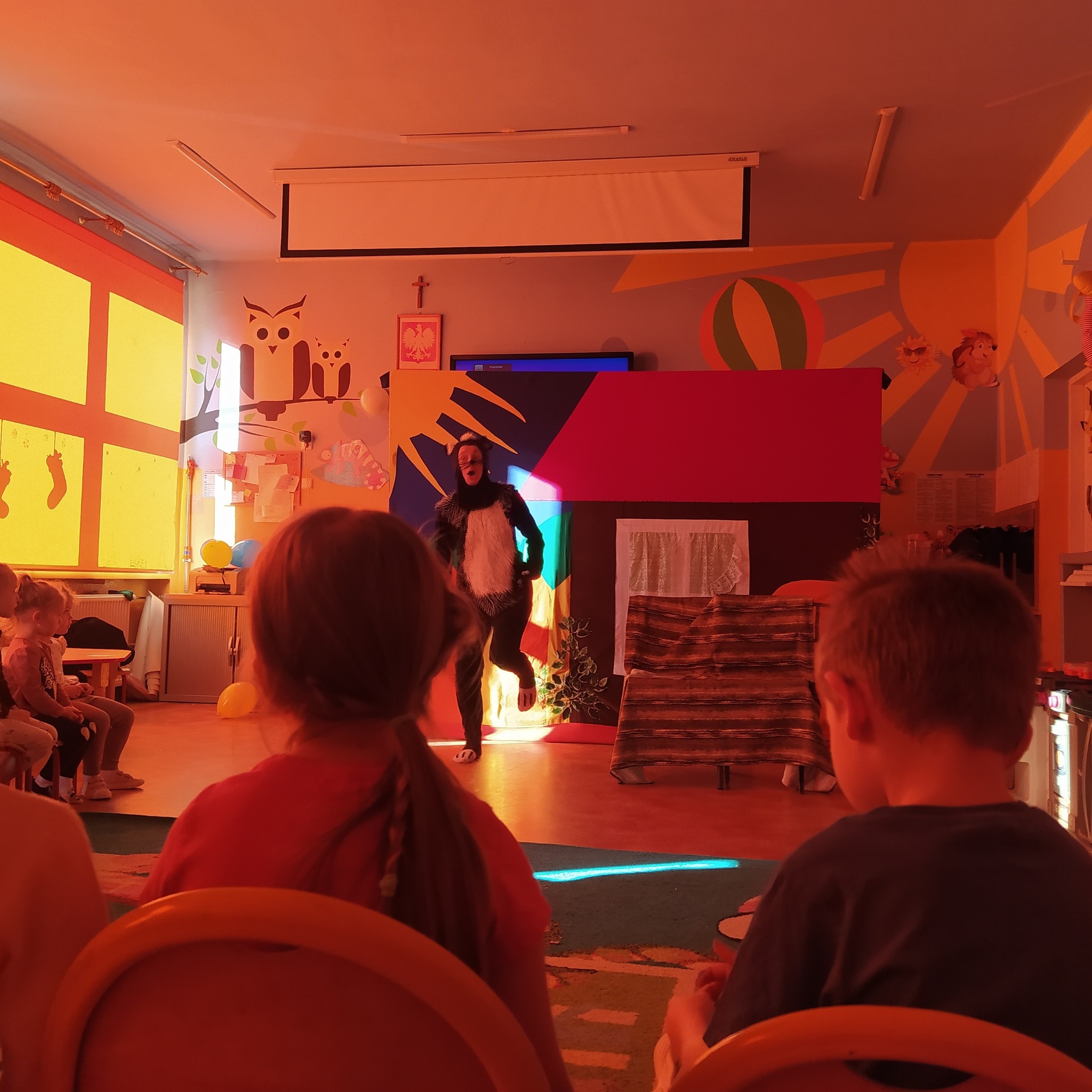 Dnia 18.11.25r.w naszym przedszkolu gościł Teatr Kalejdoskop z wystąpieniem „Kot w wielkim mieście”. Teatrzyk opowiadał o Kotce Łapsotce, która była znudzona życiem na wsi. Marzyła o wielkich podróżach. Postanawia zatem sama, nie bacząc na protesty swego przyjaciela- Zapłota, wybrać się na wycieczkę do miasta. Niestety, okazuje się, że Łapsotka kompletnie nie wie jak zachować się na ulicy, ufa każdemu napotkanemu łobuzowi…