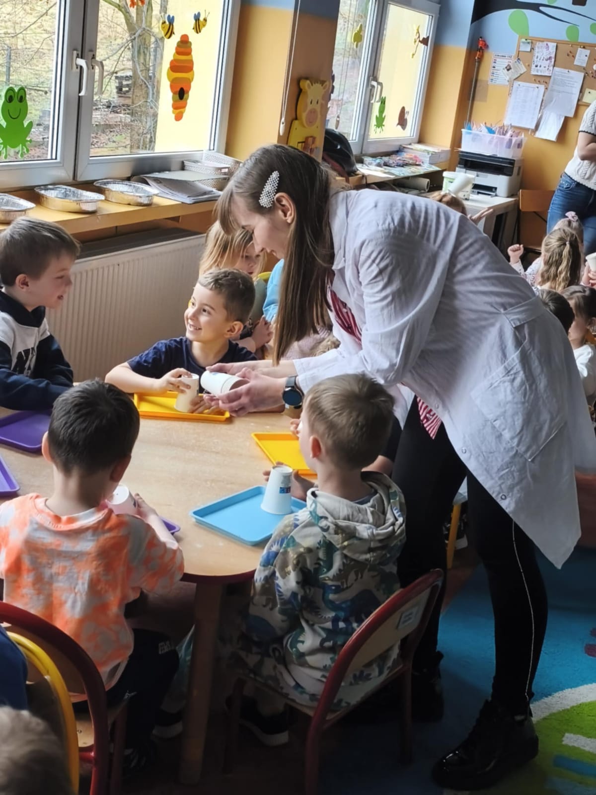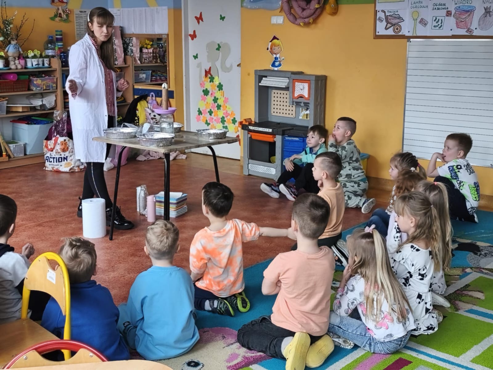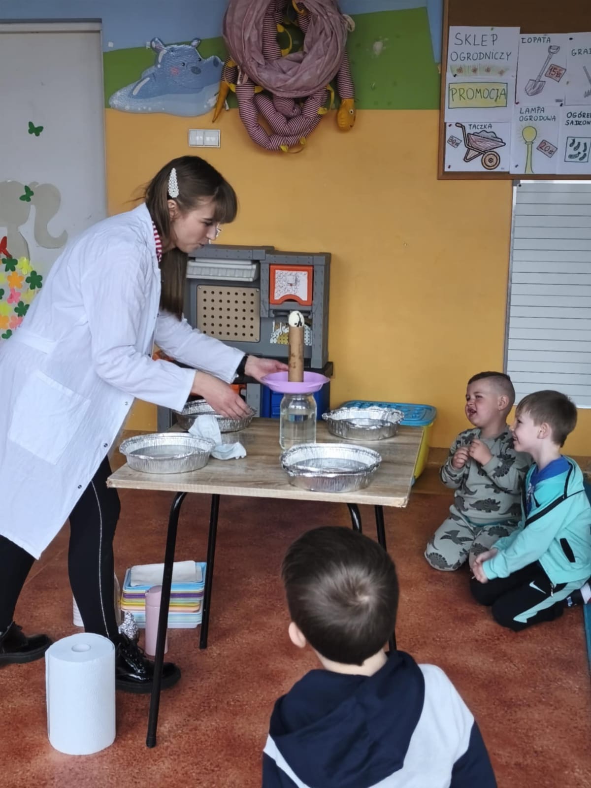 Dzieci z zapartym tchem oglądały fascynujące eksperymenty, a potem same wykonywały doświadczenia z jajkiem w roli głównej. Było mnóstwo śmiechu i wielkich emocji! Po naukowych wyzwaniach przyszedł czas na twórczą zabawę – dzieci własnoręcznie wyczarowały przepiękne ozdoby, które zabrały do domu.