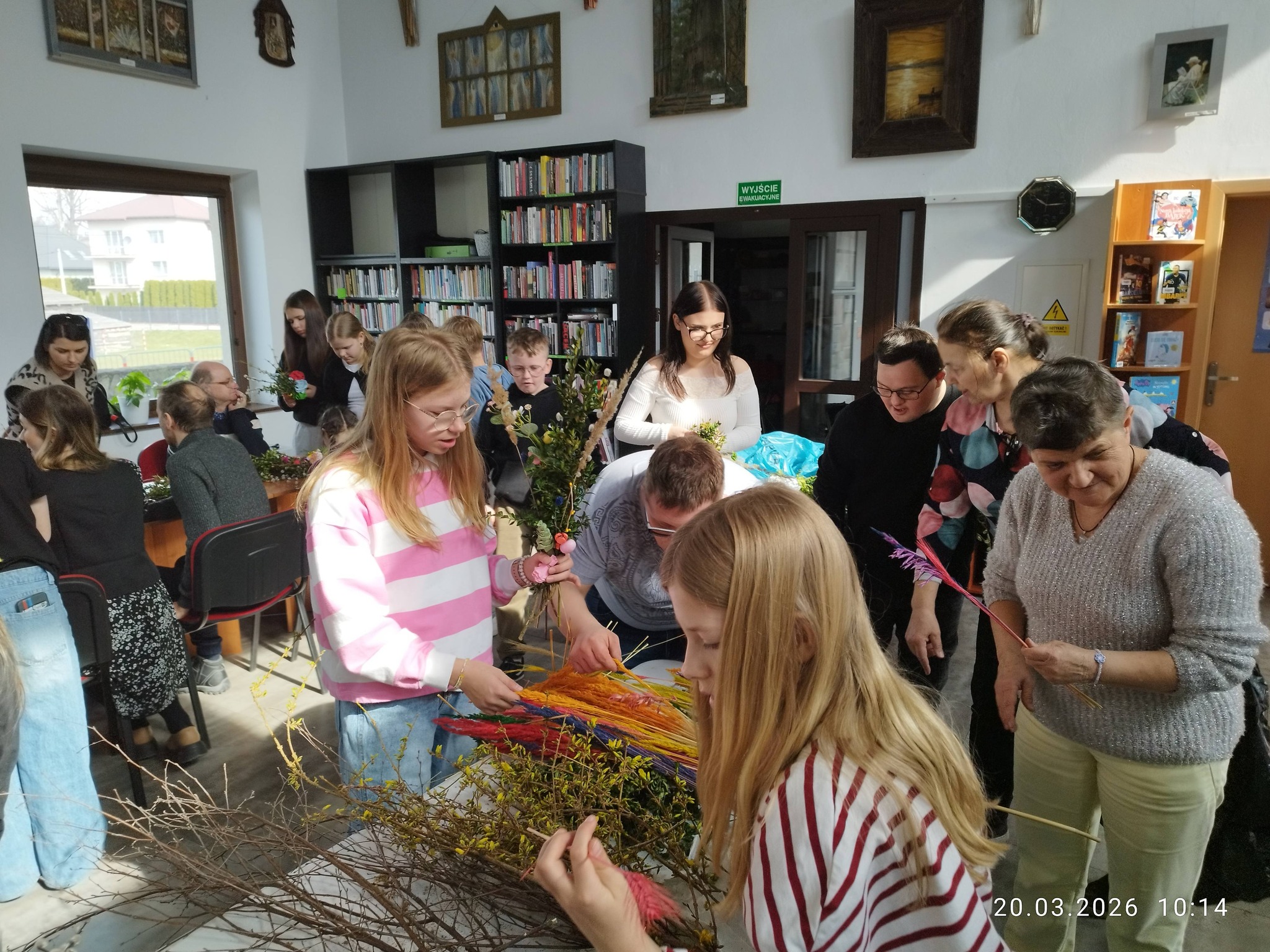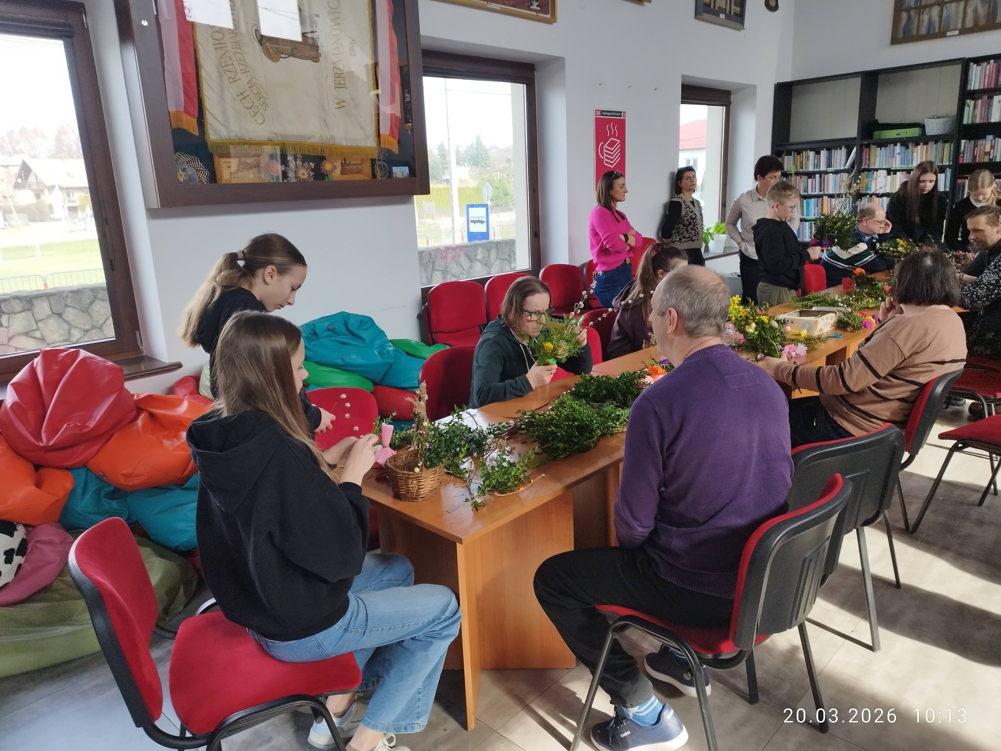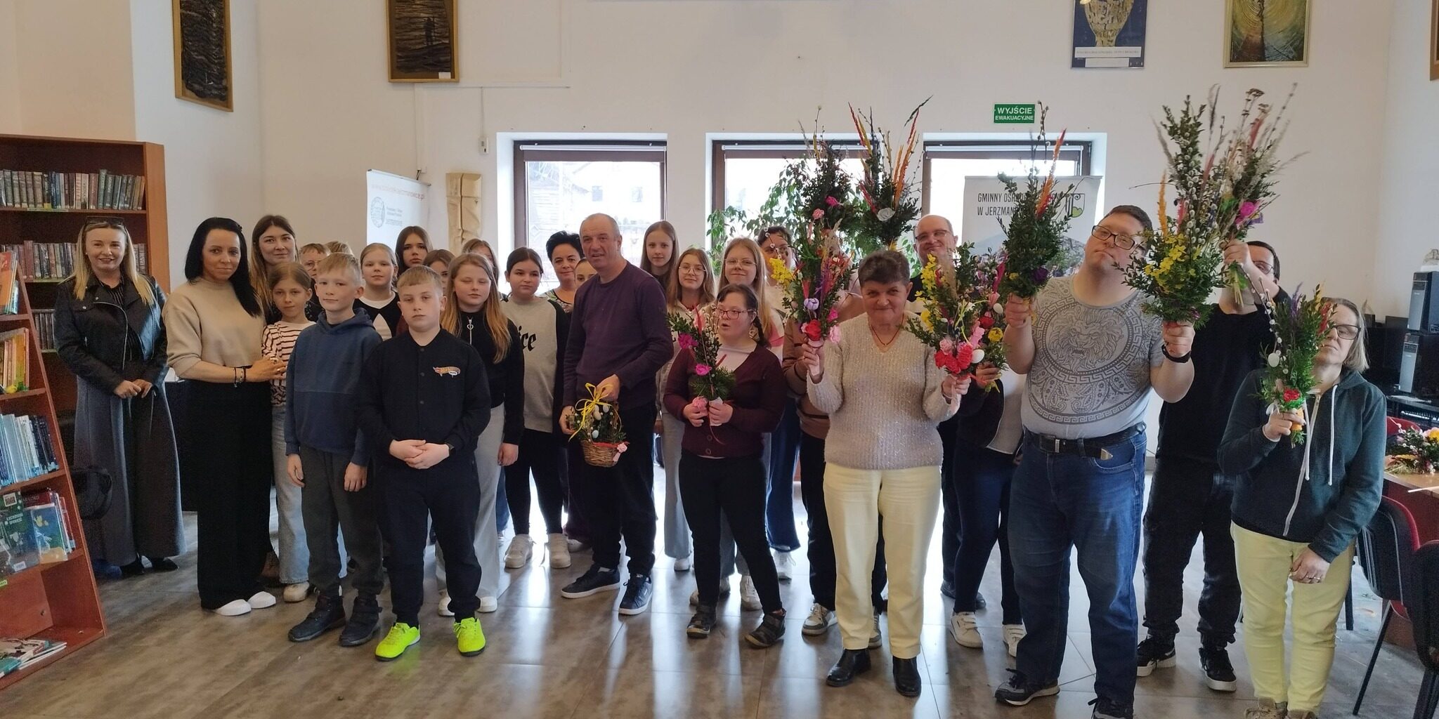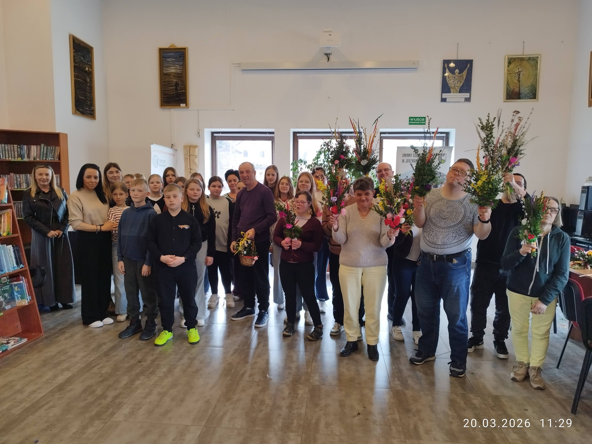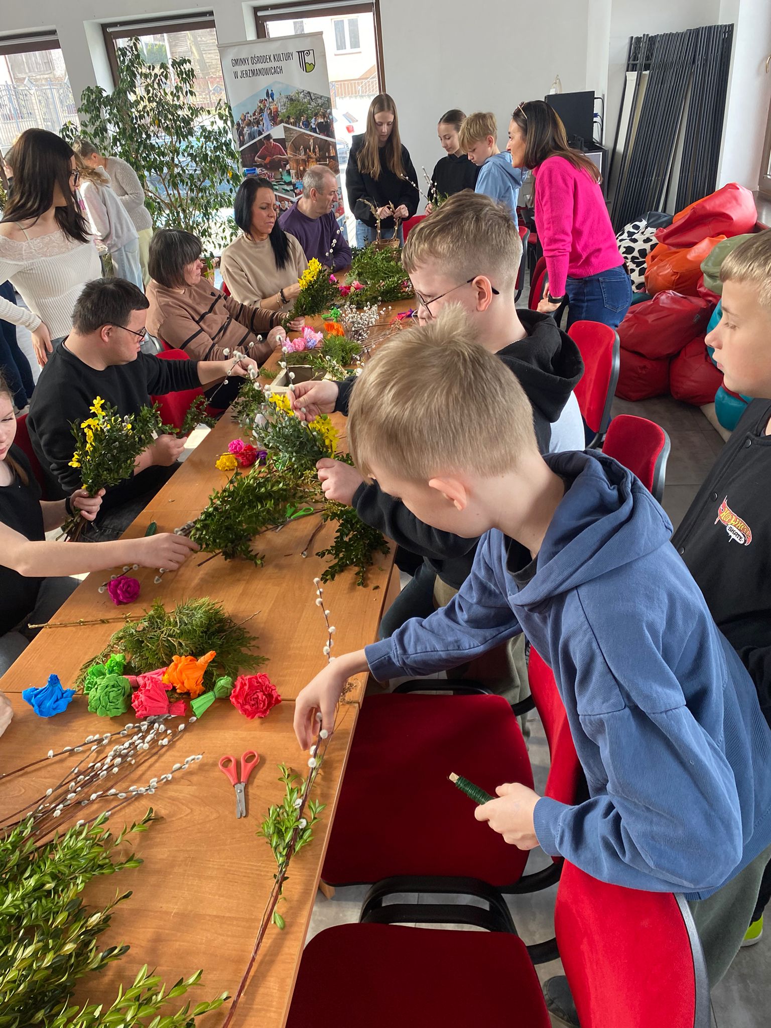Dnia 20 marca 2026 r. uczniowie szkolnego wolontariatu wraz z opiekunami odwiedzili Gminny Ośrodek Kultury w Jerzmanowicach, gdzie wspólnie z pensjonariuszami Środowiskowego Domu Samopomocy wzięli udział w warsztatach wielkanocnych. W miłej, atmosferze i dzięki pomocy naszych uczniów, z rąk podopiecznych ŚDS wyszły piękne palmy wielkanocne i stroiki, a wspólna praca stała się okazją do rozmów, uśmiechu i integracji międzypokoleniowej. To spotkanie pokazało, jak wiele radości daje dzielenie się czasem i dobrym słowem.